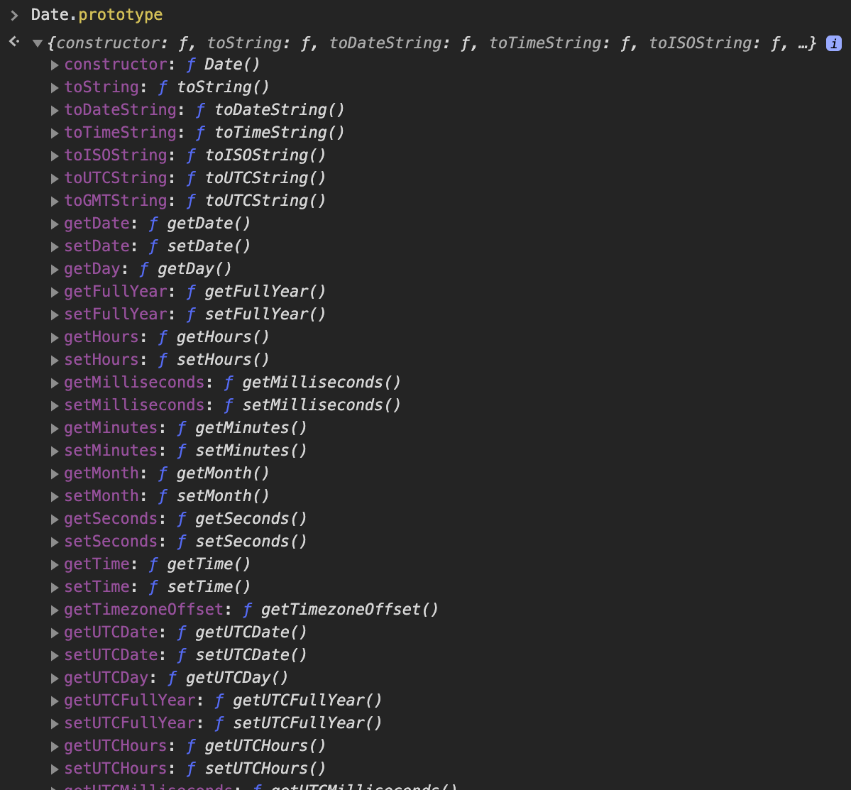 Si exploramos por ejemplo el prototipo Date.prototype podemos ver los métodos que serán accesibles a cada instancia de Date: