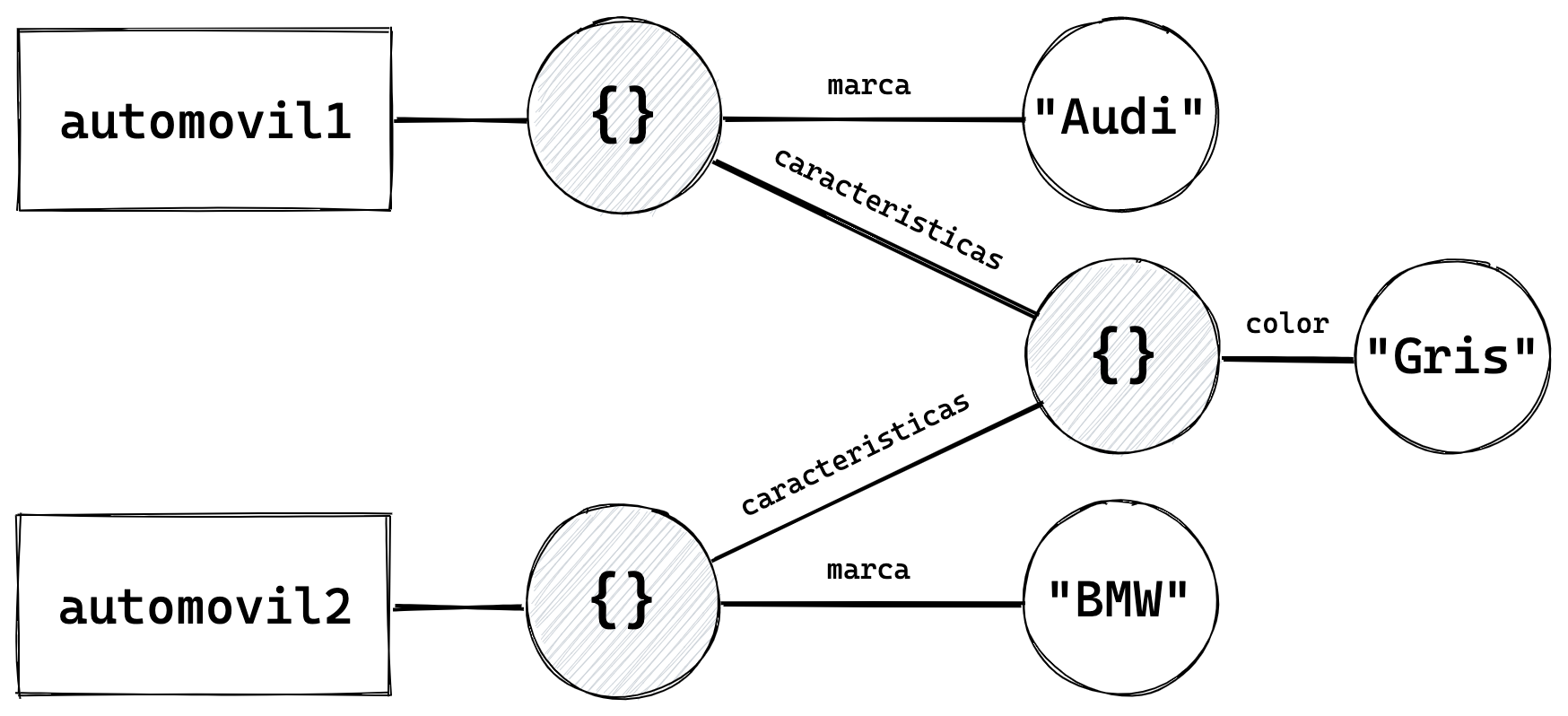Por lo cual, al modificar automovil1.caracteristicas.color, estamos modificando el objeto { color: "Rojo" }, cuyo impacto se vera en ambos automovil1 y automovil2: