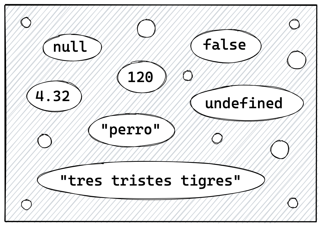 Entonces, tanto null, undefined, true, false, 3.14, y "tres tristes tigres", así como todos los números y cadenas de caracteres que podamos imaginar, habitan este universo primitivo, y nosotros simplemente los referenciamos cuando los necesitamos.